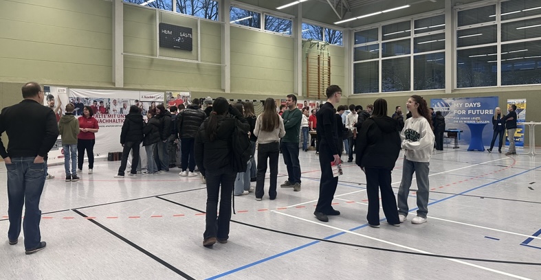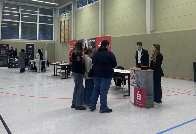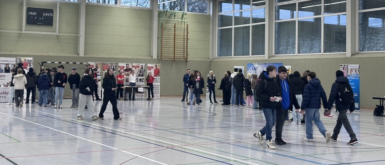 In den ersten beiden Unterrichtsstunden wurde eine Mini-Messe durchgeführt, an der zahlreiche regionale und überregionale Unternehmen teilnahmen. Die Schüler*innen hatten die Gelegenheit, direkt mit Vertreterinnen und Vertretern der Firmen ins Gespräch zu kommen und sich umfassend über Ausbildungsberufe, Ausbildungswege sowie Firmenstrukturen zu informieren. Dieses direkte Austauschformat wurde von den Jugendlichen rege genutzt.