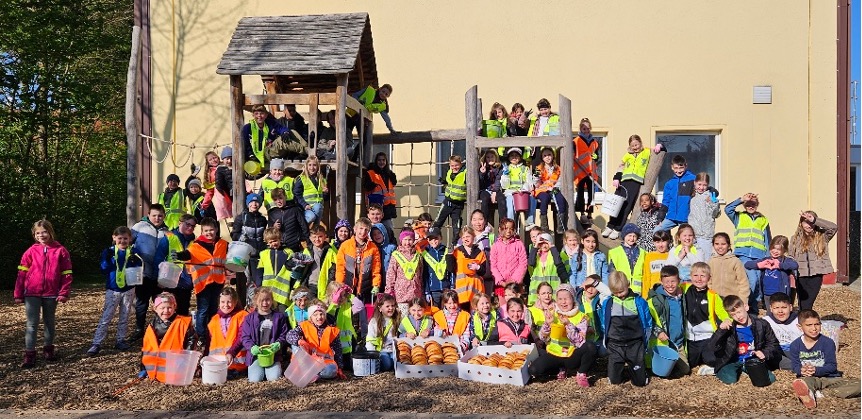 Am Freitag, den 11. April versammelten sich die 78 Schülerinnen und Schüler der Grundschule Sand mit ihren Lehrerinnen und Lehrern, um auch dieses Jahr wieder ihr Dorf von Müll zu befreien. Mit Handschuhen, Eimern und Müllzangen und ganz viel Motivation zogen sie los. Klasse 1c säuberte das Gelände rund um die Schule, die Zweitklässler waren bei den beiden Spielplätzen am Müll sammeln und die Klassen 3c und 4c waren um die Halle, den Sportplatz und die Skaterbahn fleißig.