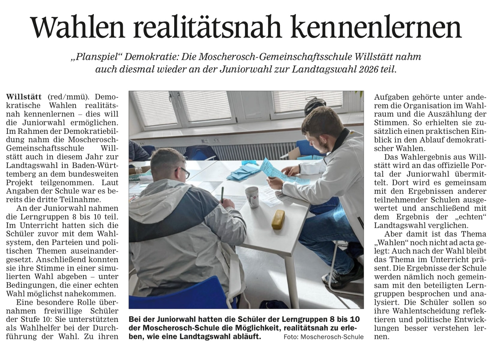Im Rahmen der Demokratiebildung hat die Moscherosch-Schule auch in diesem Jahr an der Juniorwahl zur Landtagswahl in Baden-Württemberg teilgenommen. Bereits zum dritten Mal beteiligte sich die Schule an diesem bundesweiten Projekt, das es Schüler*innen ermöglicht, demokratische Wahlen realitätsnah kennenzulernen.