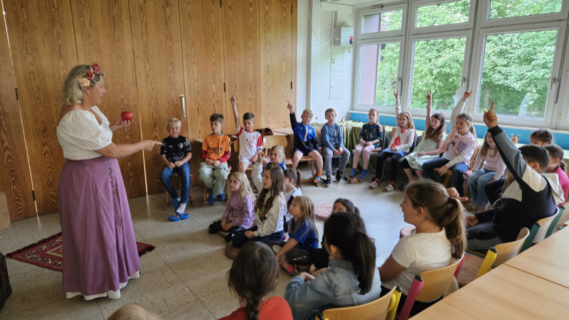 Frau Bamberg entführte die sehr gespannten und begeisterten kleinen Zuhörer ins Land der Sagen und Märchen. Diese Aktion an der GS-Sand ist in den letzten Jahren fast