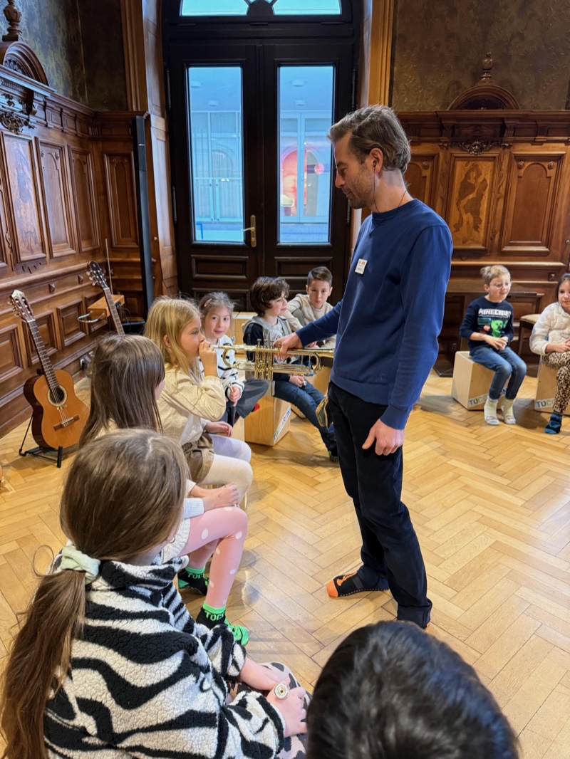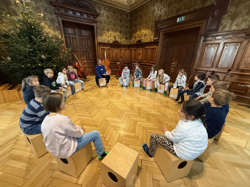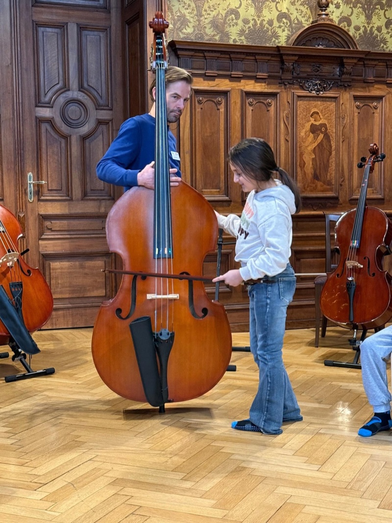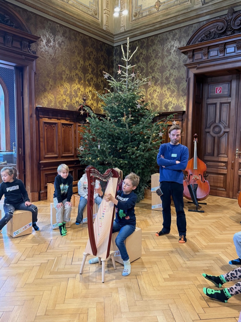 Mit viel Freude probierten die Kinder unterschiedliche Instrumente aus - von Cajón und Trompete über Harfe bis hin zum Kontrabass, dessen Bogenhaare sich als Pferdehaare überraschend enttarnten. Auch die Entstehung der Stimme erkundeten sie an einem anschaulichen Modell und experimentierten mit Stimmenverzerrern die eigene Stimme in verschiedenen ungewöhnlichen Varianten.