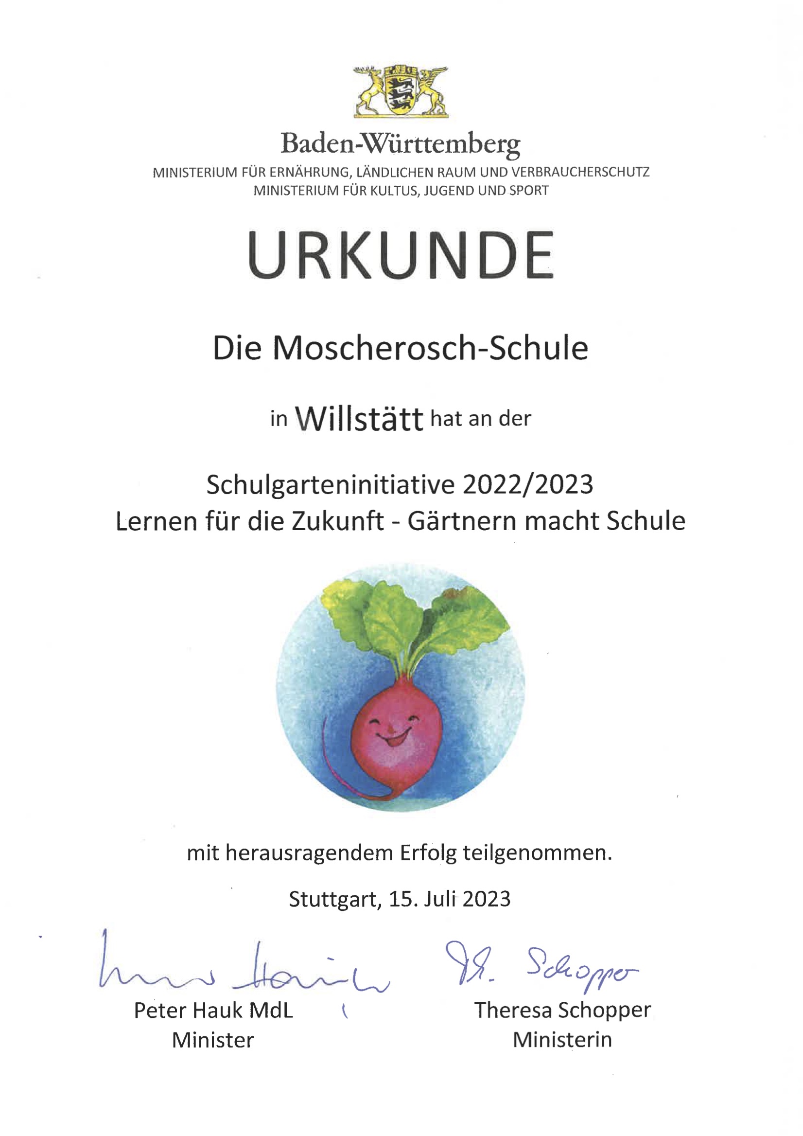 In Kooperation mit dem Verein jung & alt – für gegenseitige Hilfe e.V. in Willstätt pflegt die Moscherosch-Schule einen gemeinsamen Schulgarten. Im Rahmen der Schulgarteninitiative 2022/2023 wurde dieser sogar zu einem der besten Schulgärten im Land prämiert. Der Schulgarten kann definitiv als Blickfang auf dem Schulgelände bezeichnet werden. Mit seinem großzügig gestalteten Raum für die heimische Tier- und Pflanzenwelt ist er eine wertvolle Bereicherung des Unterrichtsangebotes.