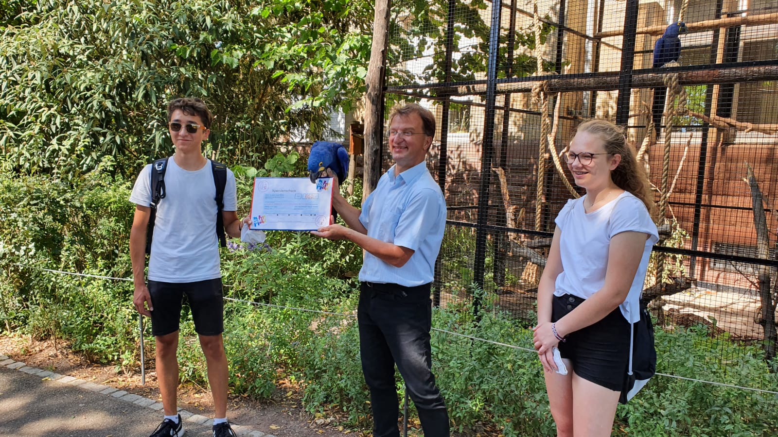 Dr. Matthias Reinschmidt freute sich sehr über diese Spende. Auch der Hyazinth-Ara „Henry“ war von so viel Engagement begeistert. Vielleicht hat er auch überlegt, was er mit dem Scheck so alles an Leckereien für sich kaufen könnte, denn wir seht, hatte er den Scheck schon fest in seinem Schnabel…