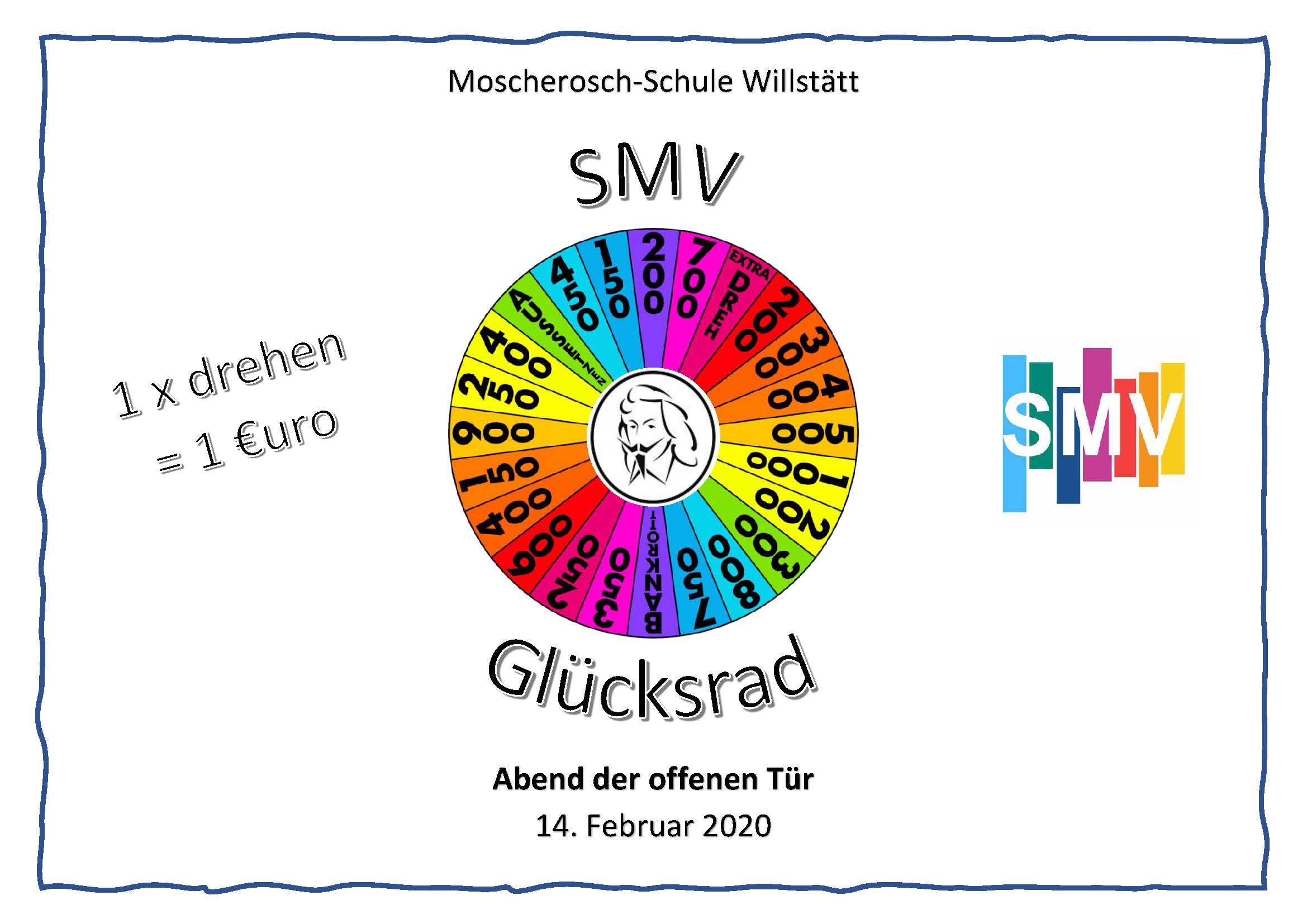 Auch beim Abend der offenen Tür beteiligte sich die SMV der Moscherosch-Schule. In diesem Jahr übernahmen wir das traditionelle Glücksrad, dass mit allerlei verschiedenen Preisen ausgestattet war. Bedanken möchten wir uns bei Familie Lutz, bei Herrn Grüninger und Herrn Schäfer, die uns mit Sachspenden unter die Arme gegriffen haben, so dass man die Möglichkeit hatte, beim Drehen des Rades, gute Gewinne zu erspielen!
